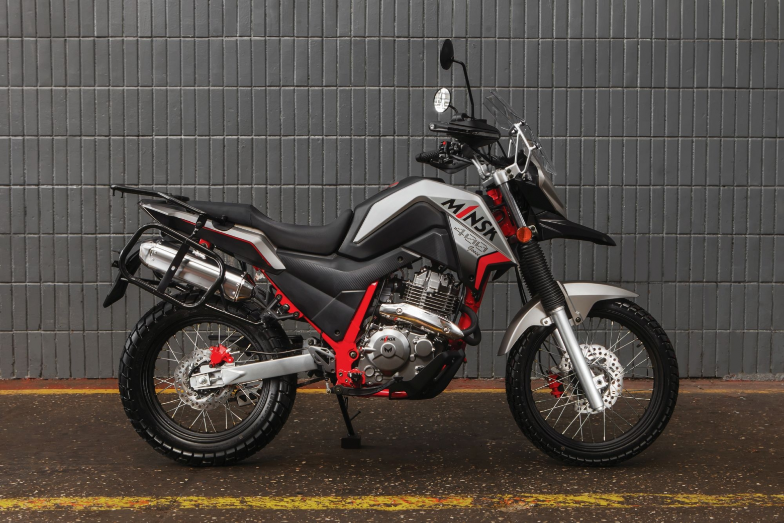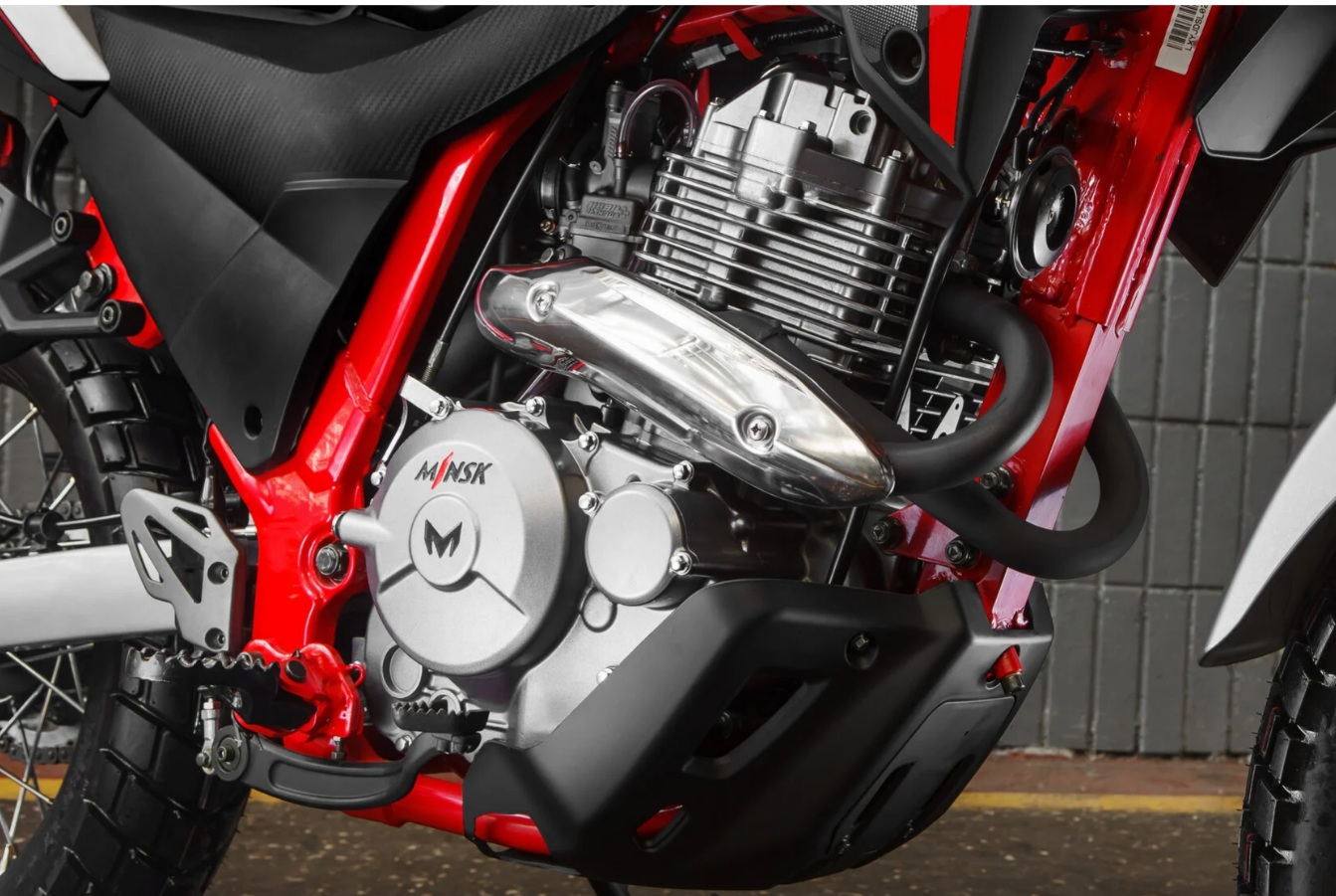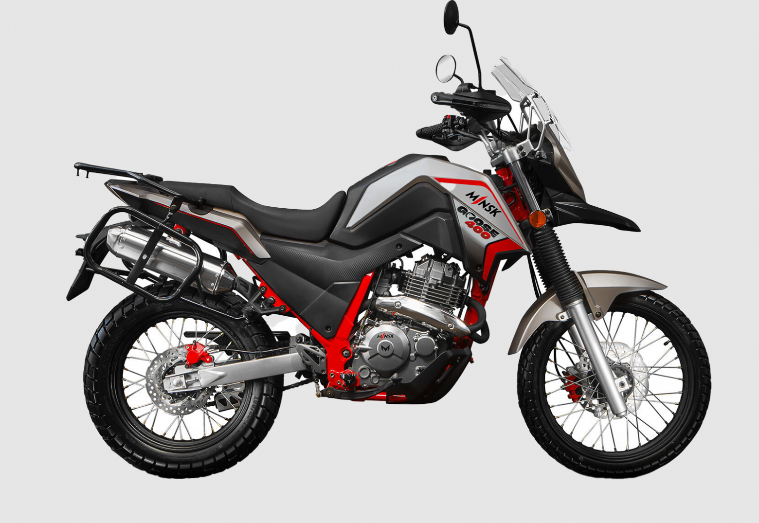 Мотоцикл Minsk GOOSE 400 - высокий ветровик, острый «клюв» переднего крыла под фарой, уверенная прямая посадка и спицованные колеса обещают комфортное передвижение как по трассам, так и по всевозможному бездорожью. Подвеска мотоцикла рассчитана на работу в условиях бездорожья, но не будет ощущаться как слишком мягкая на ровном асфальте. Двигатель одноцилиндровый, четырехклапанный, с двумя распредвалами, воздушно-масляным охлаждением и пятиступенчатой трансмиссией. В системе питания применен карбюратор. Это решение продиктовано меньшей стоимостью в сравнении с инжекторной системой питания, более простой конструкцией и повышенной ремонтопригодностью. При этом мощность двигателя составляет 27,3 лошадиные силы, с впечатляющим значением крутящего момента в 32,5 Н/м, которые выдаются уже при 5000 об/мин, позволяя развивать скорость до 120 км/ч. Воздушно-масляная система охлаждения мотора реализована с использованием передней части рамы в качестве радиатора. Это позволило исключить лишние детали и компоненты, а значит и возможность их повреждения. За характерную внешность мотоцикл еще до официального выхода на рынок получил понятное каждому турэндуро прозвище «Гусь». В описании указаны основные характеристики товара.