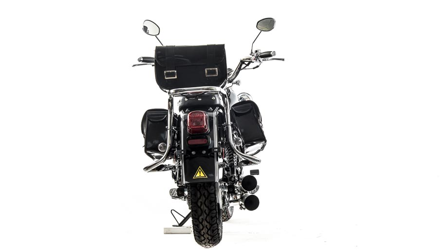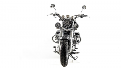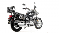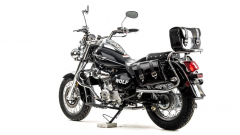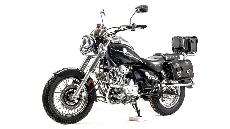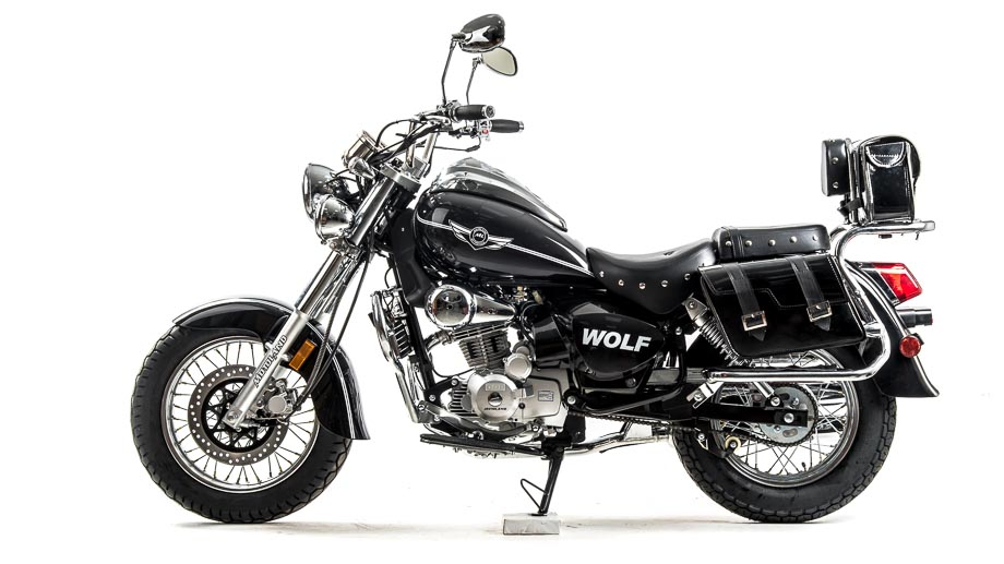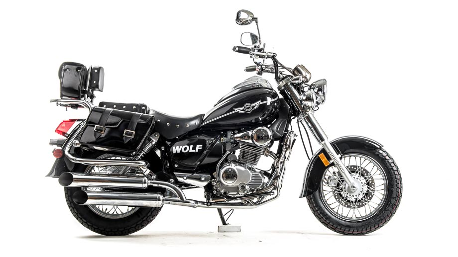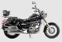 Дорожный мотоцикл MOTOLAND WOLF 250 - стильный и лаконичный дизайн способен порадовать глаз любого мужчины. Мощный движок и крутейшие технические характеристики - вот, что отличает его от собратьев. Этот байк просто создан для езды по городским джунглям! Чоппер WOLF 250 сразу привлекает внимание своим внешним видом. Выполнен в винтажно-классическом стиле с удлинённой рамой и передней вилкой, обилием хромированных элементов. Солидный, матово-чёрного цвета — этот чоппер выглядит значительно лучше своей ценовой категории. Мото чоппер весит 130 кг. Колёса спицованные, диаметр колёс — 16 дюймов (400 мм). Передний тормоз гидравлический дисковый с однопоршневым суппортом, прочно закреплён на 6 болтов. Тормозной шланг защищён специальным изолятором. Задний тормоз барабанный, легко регулируется даже в полевых условиях. Рама классическая, закольцованного типа. Вилка телескопическая, удлинённой формы, дополнительно защищена специальными металлическими кожухами. Есть нижние и верхние массивные траверсы. Руль сечения 22 мм с высоким подъёмом удобен для мотоциклистов разного роста. Зеркала заднего вида большие, с хорошим обзором. На ручках расположены кнопки дальнего и ближнего света, сигнал аварийной остановки, кнопки включения и выключения двигателя, блинкер, поворотники, звуковой сигнал. Также на руль вынесен подсос, что удобно при холодном запуске. Переднее и заднее крыло сделаны из прочного жёсткого пластика и близко прилегают к колёсам, подчёркивая городское и шоссейное назначение чоппера. На заднем крыле установлен стоп-сигнал и крепление для номера. Удлинённый руль и форма сиденья делают посадку максимально комфортной и позволяют держать спину прямо, снимая часть нагрузки с поясницы. Большое сиденье удобно для длительных поездок. Сиденье для пассажира оснащено специальной мягкой спинкой. Чоппер просто утопает в свете. На мотоцикл установлена большая фара ближнего и дальнего света, большие поворотники, светоотражатели. Такой чоппер невозможно не заметить даже в темноте или при плохой видимости. Купить мотоцикл чоппер стоит и за технические характеристики. Мото чоппер оснащён 4-тактным 1-цилиндровым двигателем с воздушным и маслорадиаторным охлаждением. Мотор мощностью 18 л. с. и объёмом 250 кубов разгоняет чоппер до 110 км/ч. Карбюратор с ускорительным насосом даёт хороший отклик на резкий старт и позволяет быстро набрать скорость. Расход топлива небольшой — 4 литра на 100 км. Трансмиссия механическая, включает 5 скоростей. Подножки удобные, дают возможность легко переключать передачи. Мотоцепь 420 защищена специальным кожухом. На чоппер установлены 2 выхлопные трубы. На панели приборов есть спидометр, индикаторы поворотников, индикатор нейтральной передачи, дальний свет. Здесь Вы можете получить всю информацию о состоянии мотоцикла: километраж, пробег, скорость, обороты двигателя. В описании указаны основные характеристики товара.