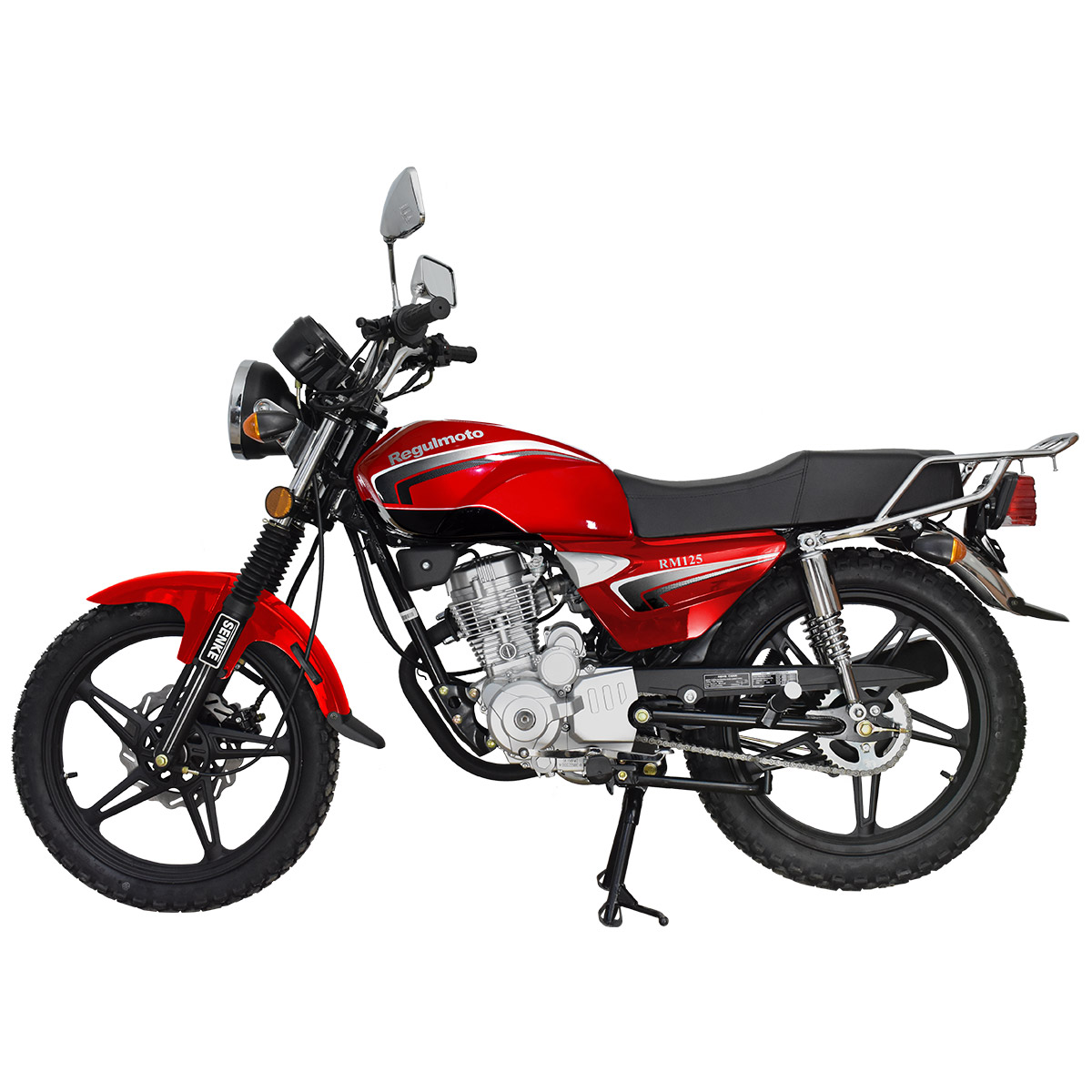 Regulmoto RM 125 – классический дорожный мотоцикл с надежным и экономичным двигателем небольшой кубатуры, который станет отличным выбором для повседневных поездок и утилитарного использования, как для начинающих, так и для опытных мотоциклистов. Мотоцикл Regulmoto RM 125 – популярная модель в ряду мототехники известного китайского производителя Senke, благодаря доступности и простоте эксплуатации заслужившая признание поклонников мототехники во всем мире. В раме байка с 18-дюймовыми колесами на легкосплавных дисках установлен одноцилиндровый 4-тактный двигатель с воздушным охлаждением рабочим объемом в 124 см3, способный развивать мощность 10,8 лошадиных сил. Подвеска мотоцикла представлена телескопической вилкой спереди и двумя амортизаторами сзади. Комфорт повседневного использования также обеспечивают электростартер, аналогово-цифровая приборная панель с замком зажигания, удобное сиденье, складные подножки пассажира, крепкий багажник, широкие крылья с брызговиками, центральная и стояночная подножка. За безопасность эксплуатации отвечают дисковый тормоз на переднем колесе и барабанный тормоз сзади. Regulmoto RM 125 оснащен полным комплектом оборудования, необходимого для передвижения по дорогам общего пользования: передние и задние поворотники, стоп-сигнал, фара головного света, на руле также установлены зеркала заднего вида. С мотоциклом Regulmoto RM 125 вы получите возможность не только оперативно решать повседневные дела – вы можете стать обладателем незаменимого помощника для утилитарных задач с доступной ценой и недорогим сервисным обслуживанием. У нас Вы можете купить этот мотоцикл с бесплатной доставкой по РФ и гарантией до года. Также его можно приобрести в рассрочку или в кредит. В описании указаны основные характеристики товара.