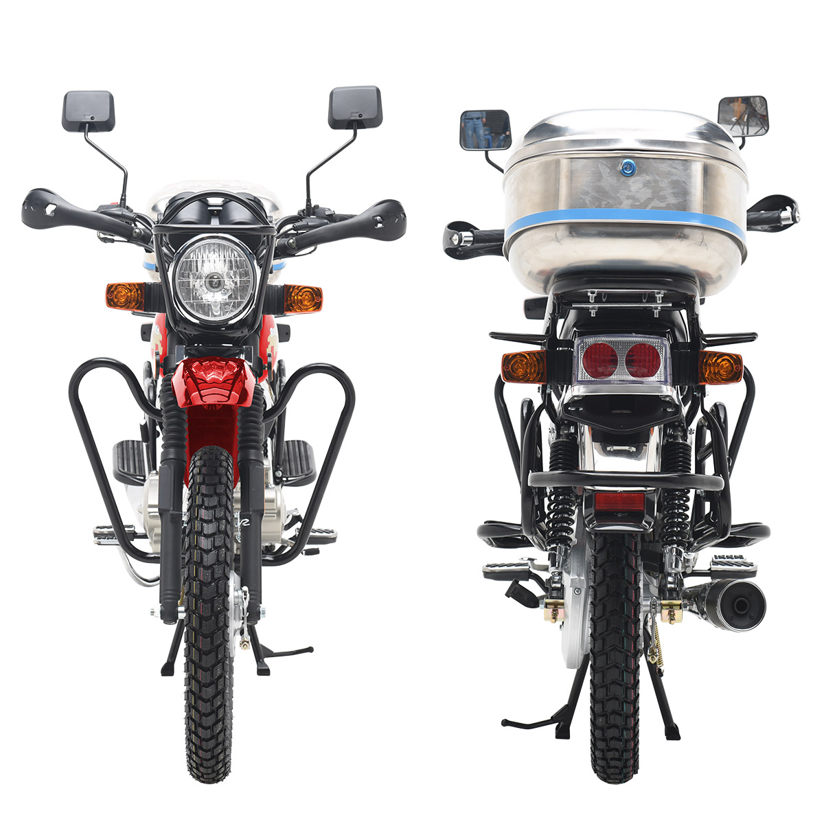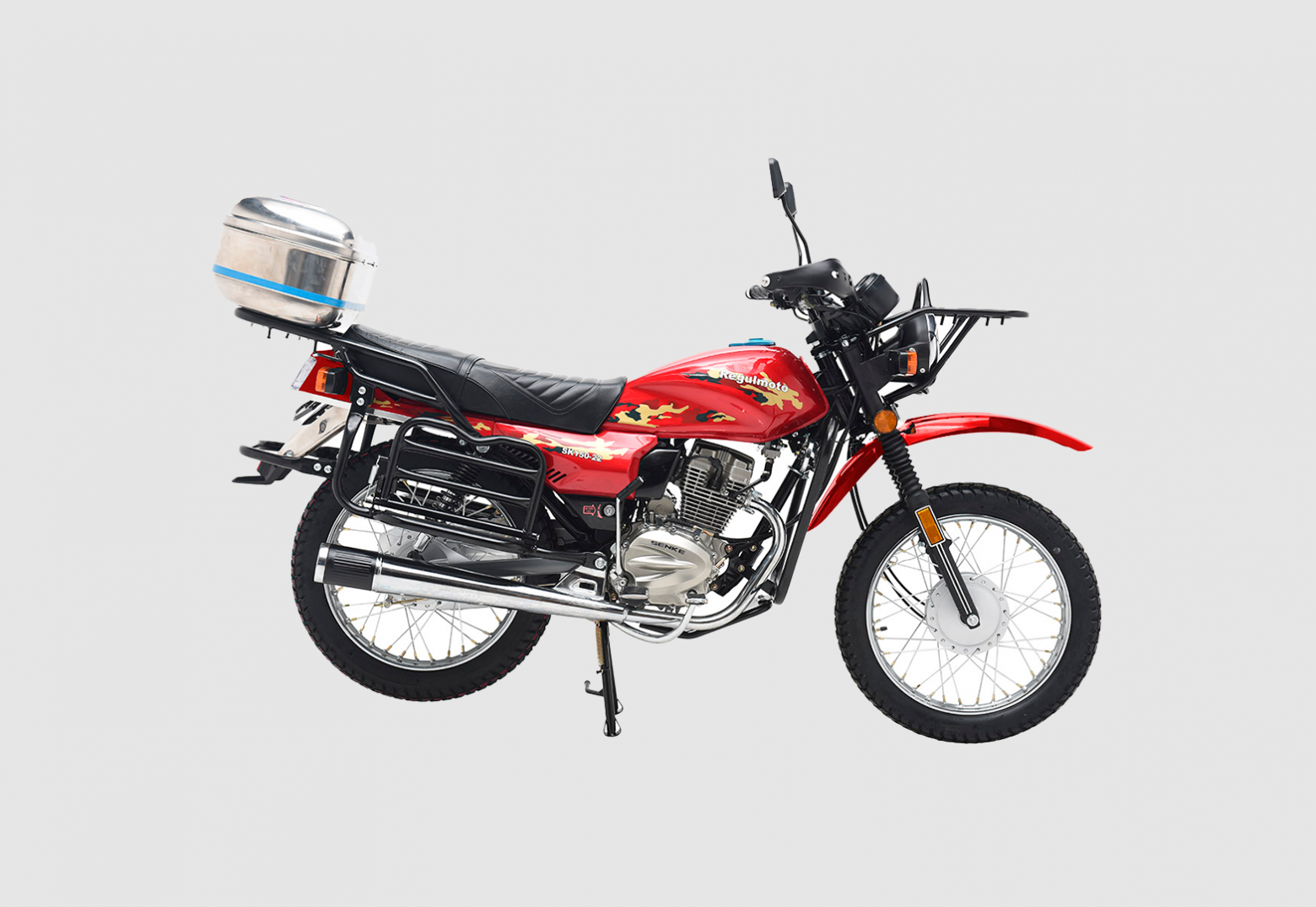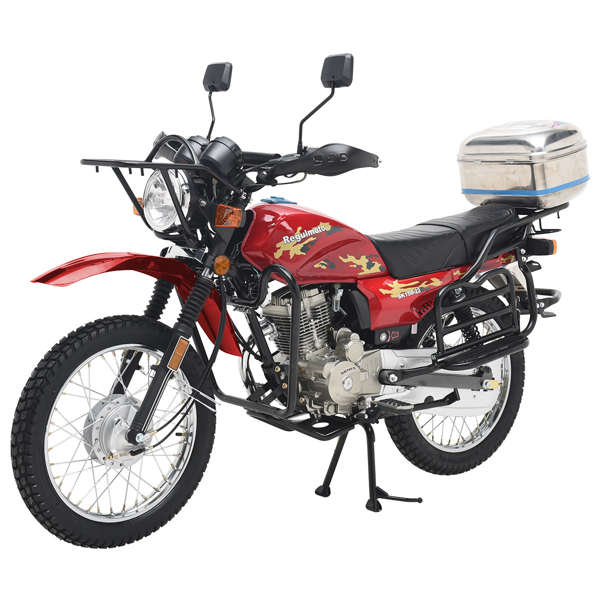 Мотоцикл Regulmoto SK 150-22 – классический «дорожник» с надежным и экономичным малокубатурным двигателем. Данная модель изготавливается на собственных мощностях крупного китайского производителя Senke. Несмотря на классический внешний вид Regulmoto SK 150-22 отличается достаточно интересным и продуманным дизайном. В раме мотоцикла установлен одноцилиндровый 4-тактник с воздушным охлаждением с рабочим объемом в 149 см3. Двигатель можно запускать как кнопкой электростартера, так и при помощи традиционного кик-стартера. В целом байк выглядит лаконичным и современным – еще одной приметой актуальных трендов стали спицованные диски переднего 18-дюймового и заднего 18-дюймового колес. Характерная для «дорожников» подвеска представлена телескопической вилкой спереди и двумя амортизаторами сзади. Широкое комфортное сиденье и вместительный бак Regulmoto SK 150-22 недвусмысленно указывают на назначение мотоцикла, окончательную ясность вносят багажник, складывающиеся пассажирские подножки и наличие мощной центральной подножки. Безопасность эксплуатации на дорогах общего пользования обеспечивают обязательный комплект зеркал заднего вида и светового оборудования, включающего фару головного света, светодиодные поворотники и стоп-сигнал. Этот мотоцикл станет отличным выбором в качестве транспортного средства на каждый день и позволит своему обладателю с комфортом решать широкий круг повседневных задач. В описании указаны основные характеристики товара.