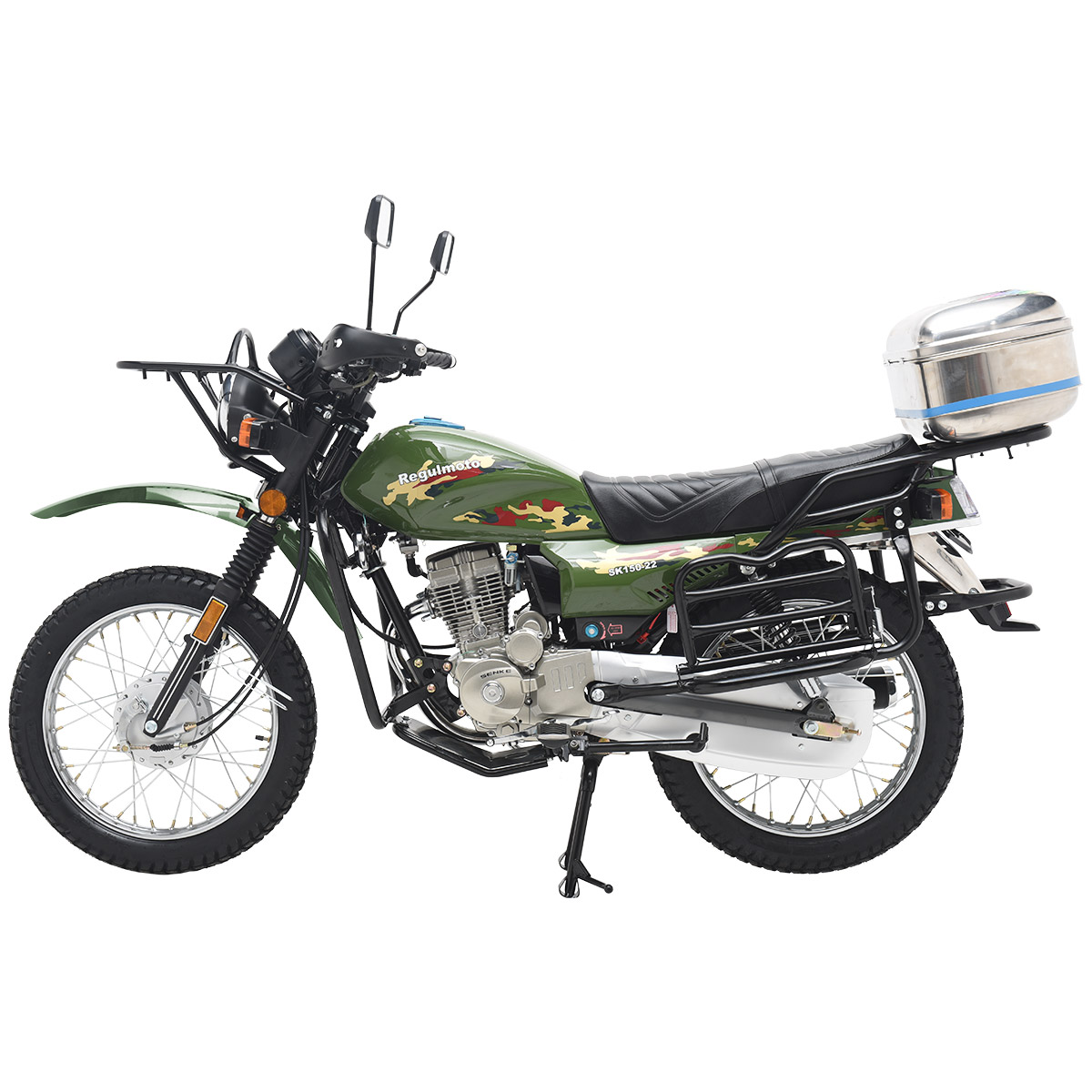 Мотоцикл Regulmoto SK 150-22 – классический «дорожник» с надежным и экономичным малокубатурным двигателем. Данная модель изготавливается на собственных мощностях крупного китайского производителя Senke. Несмотря на классический внешний вид Regulmoto SK 150-22 отличается достаточно интересным и продуманным дизайном. В раме мотоцикла установлен одноцилиндровый 4-тактник с воздушным охлаждением с рабочим объемом в 149 см3. Двигатель можно запускать как кнопкой электростартера, так и при помощи традиционного кик-стартера. В целом байк выглядит лаконичным и современным – еще одной приметой актуальных трендов стали спицованные диски переднего 18-дюймового и заднего 18-дюймового колес. Характерная для «дорожников» подвеска представлена телескопической вилкой спереди и двумя амортизаторами сзади. Широкое комфортное сиденье и вместительный бак Regulmoto SK 150-22 недвусмысленно указывают на назначение мотоцикла, окончательную ясность вносят багажник, складывающиеся пассажирские подножки и наличие мощной центральной подножки. Безопасность эксплуатации на дорогах общего пользования обеспечивают обязательный комплект зеркал заднего вида и светового оборудования, включающего фару головного света, светодиодные поворотники и стоп-сигнал. Этот мотоцикл станет отличным выбором в качестве транспортного средства на каждый день и позволит своему обладателю с комфортом решать широкий круг повседневных задач. В описании указаны основные характеристики товара.