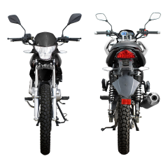Компания «Regulmoto» представляет вниманию поклонников двухколесной мототехники мотоцикл Regulmoto SK200-9 – надежный и доступный для многих байк с широкими эксплуатационными возможностями. Мотоцикл Regulmoto SK200-9 – один из ярких представителей линейки малокубатурной мототехники известного азиатского производителя Senke. Мотоциклы производства одного из крупнейших китайских концернов пользуются заслуженным признанием экспертов и мотолюбителей в различных частях света, включая Европу и Америку. Продукцию Senke отличают не только одно из лучших на рынке соотношений достойного качества и демократичной цены, но и солидный эксплуатационный ресурс, высокая надежность, простое и недорогое сервисное обслуживание. В раме мотоцикла с 18-дюймовыми колесами на литых дисках установлен 4-тактный 200-«кубовый» двигатель с воздушным охлаждением, который способен развивать максимальную мощность в 13,6 лошадиных сил. Наличие у двигателя балансирного вала способствует снижению вибрации при работе мотора. 5-ступенчатая трансмиссия, электростартер, полноценная подвеска, представленная телескопической вилкой спереди и двумя амортизаторами и маятником сзади, цифровая приборная панель и емкий топливный бак – все это позволит получать максимум удовольствия от поездки. За безопасность использования мотоцикла Regulmoto SK200-9 отвечают надежная тормозная система (дисковый тормоз спереди и барабанный сзади), комплект светового оборудования и зеркал заднего вида. Regulmoto SK200-9 отличают современный внешний вид и обширные возможности практического использования: комплектация байка dual-sport резиной и увеличенный дорожный просвет позволяет эксплуатировать его как на асфальтированных дорогах, так и на проселках и тропах, включая легкое бездорожье. В описании указаны основные характеристики товара.