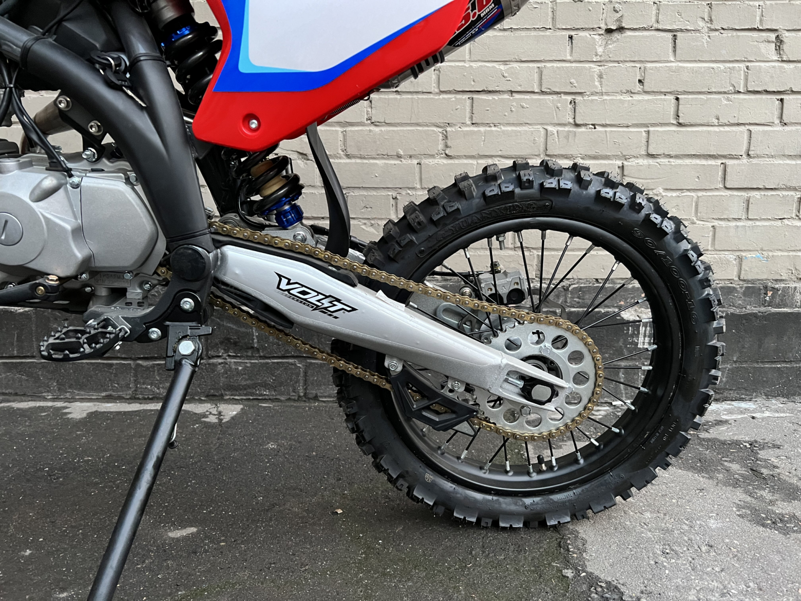 Маятник: СтальнойРуль: FATBAR 28/22 мм, стальнойГрипсы: VOLT Racing чёрныеТраверсы: Кованый алюминийТормоза дисковые [пер./зад.]: 220/190ммЦепь: KMC428Выхлопная труба: cтальнаяГлушитель: VOLT 5.0 алюминий