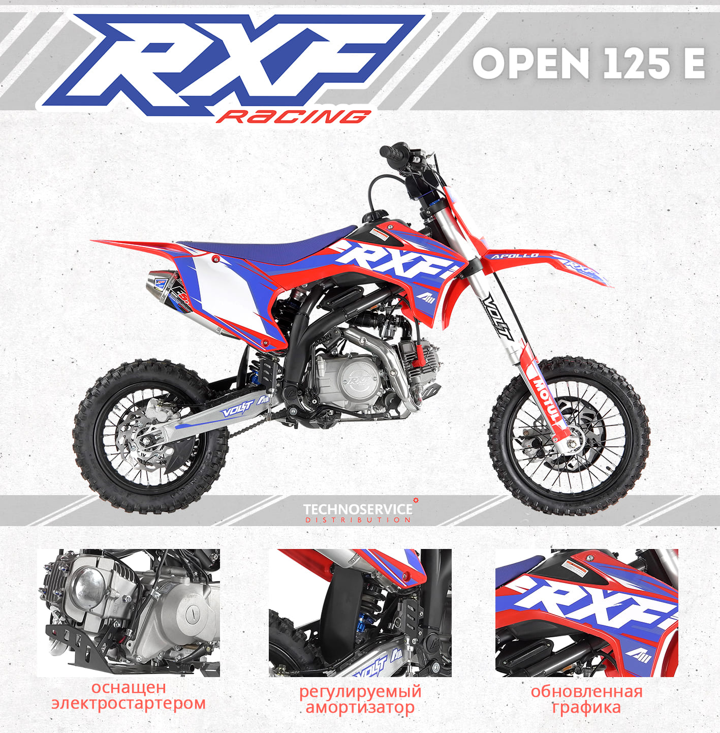 Представляем Вам обновленный RXF Open 125 E 14/12. Модель получила новую графику, задний амортизатор с регулировкой и двигатель с электростартером. Питбайк занимает промежуточную ступень между моделями Junior и Freeride и отлично подойдет как подросткам так и настоящим фанатам, признающим питбайки только на колесах 14/12. Двигатель с электростартером сможет запустить даже ребенок, а регулируемый задний амортизатор позволит настроить подвеску под ваш стиль катания. В описании указаны основные характеристики товара.