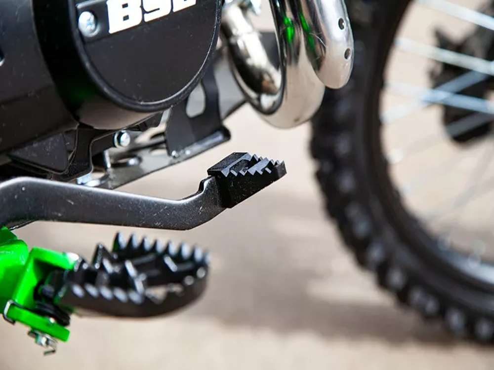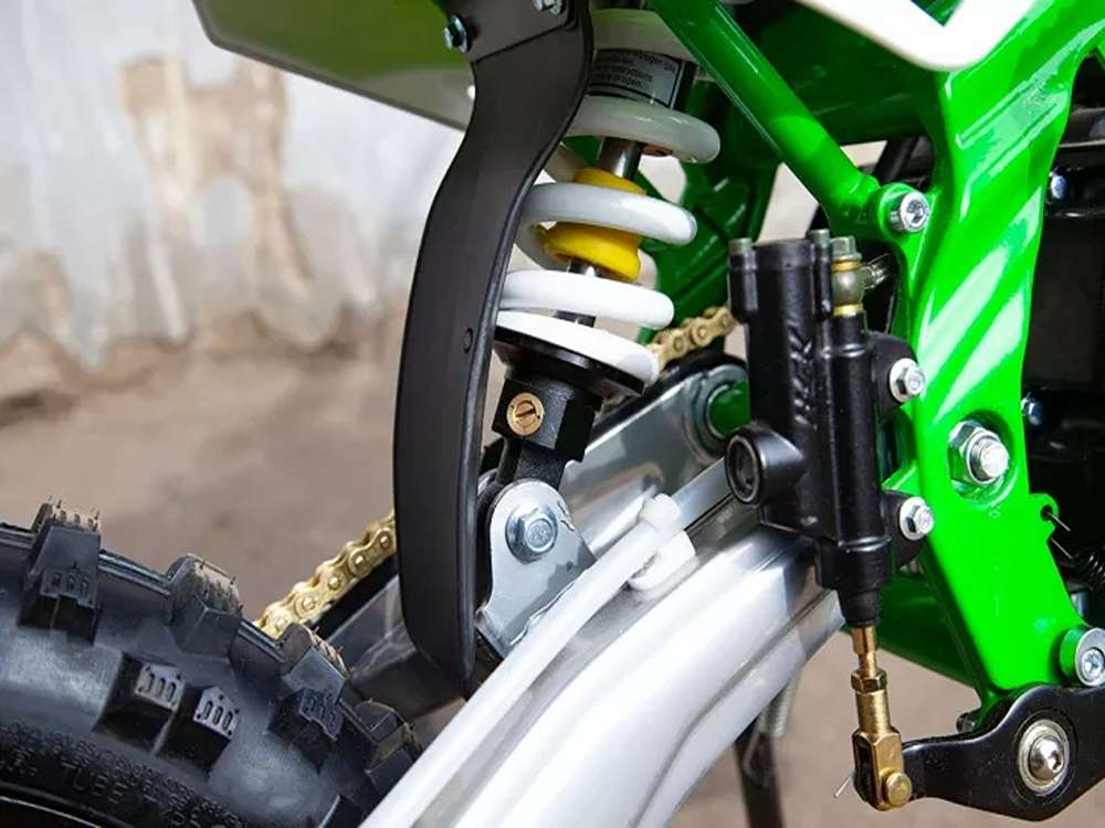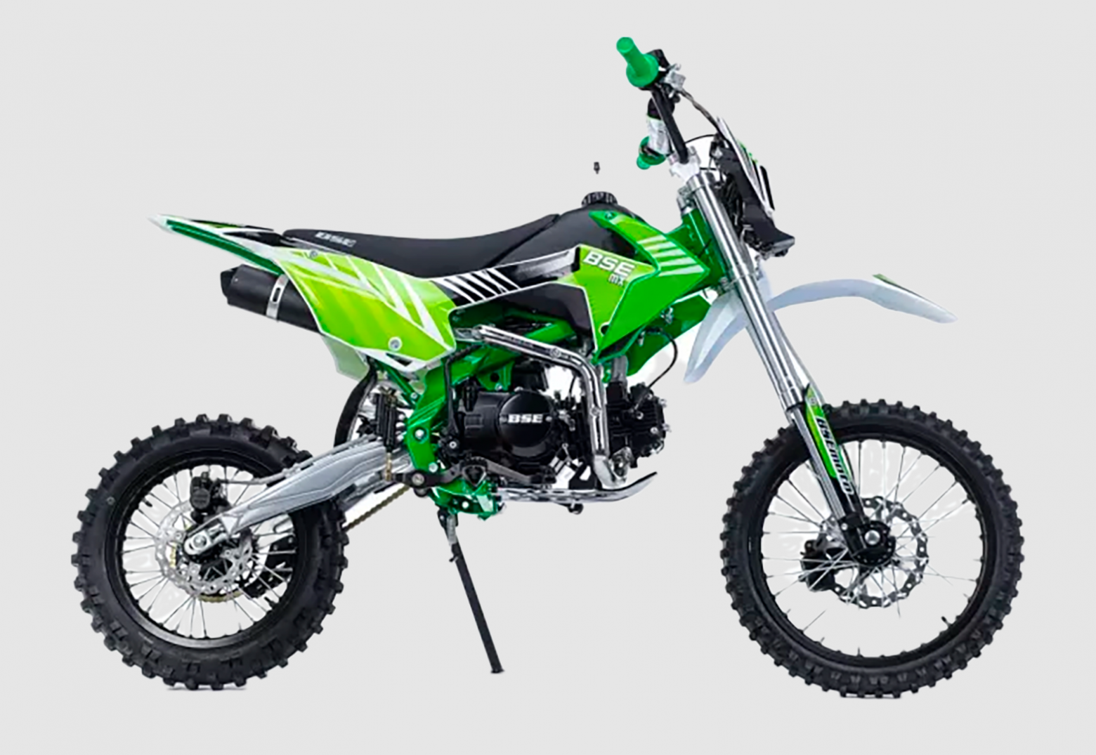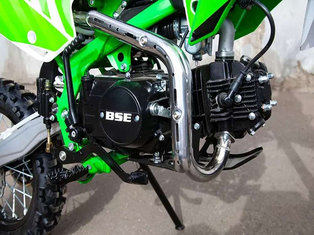 Питбайк BSE MX125 17/14 Racing Green - отличный выбор для тех, кто делает первые шаги в мире спорта, кросса и оффроада. В оригинальной, усиленной, хромомолибденовой раме BSE, устанавливается мощный 4-х тактный двигатель Zonghshen 125 куб см с воздушным охлаждением и 4-ступенчатой коробкой, в рабочем тандеме с спортивным карбюратором MIKUNI VM 22 способный развивать мощность 10 лошадиных сил. Удлиненная колесная база и превосходная подвеска увеличивает курсовую устойчивость питбайка и позволяет райдеру с большим комфортом управлять им на прямых участках трассы и с легкостью проходить "острые" повороты и подъёмы и любые неровности. Мощная тормозная система HSK Racing c армированными тормозными шлангами. Подвеска питбайка базируется на традиционном выборе комплектующих: телескопическая вилка-«перевертыш» впереди и моноамортизатор сзади. Настройки отбоя/сжатия имеются только у заднего амортизатора, работа вилки корректируется заменой масла. MX 125 укомплектован резиной с увеличенным грунтозацепом, фильтрбоксом, короткоходной ручой газа. В описании указаны основные характеристики товара.