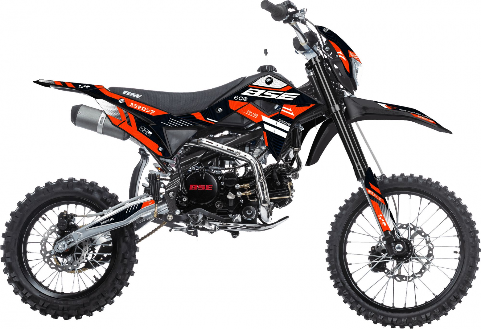 Питбайк BSE PH 150 19/16 AK47 Red (015). Основа PH150 - рама из хромомолибденовой стали повышенной жесткости с литыми усилителями - фирменный знак качества завода BOSUER! Cиловая установка питбайка - надежный и тяговитый 4-тактным двигателем YX объёмом 150 см3 с воздушным охлаждением. Максимальная мощность – внушительные 15 лс. Питает мотор карбюратор MIKUNI VM22. Питбайк оснащен 4-ступенчатой механической трансмиссией. Запуск мотора осуществляется при помощи электростартера или кик-стартера. Подвески с большими ходами: передняя - телескопическая вилка перевёрнуто типа, задняя- моноамортизатор. LED фара головного света, "злая" резина, vощная тормозная система HSK Racing, японские колесные подшипники NTN, защита мотора, руль ProTaper - питбайк полностью укомплектован всем необходимым для покатушек и гонок. PH150 – профессиональный выбор самого продвинутого "питбайкера". В описании указаны основные характеристики товара.