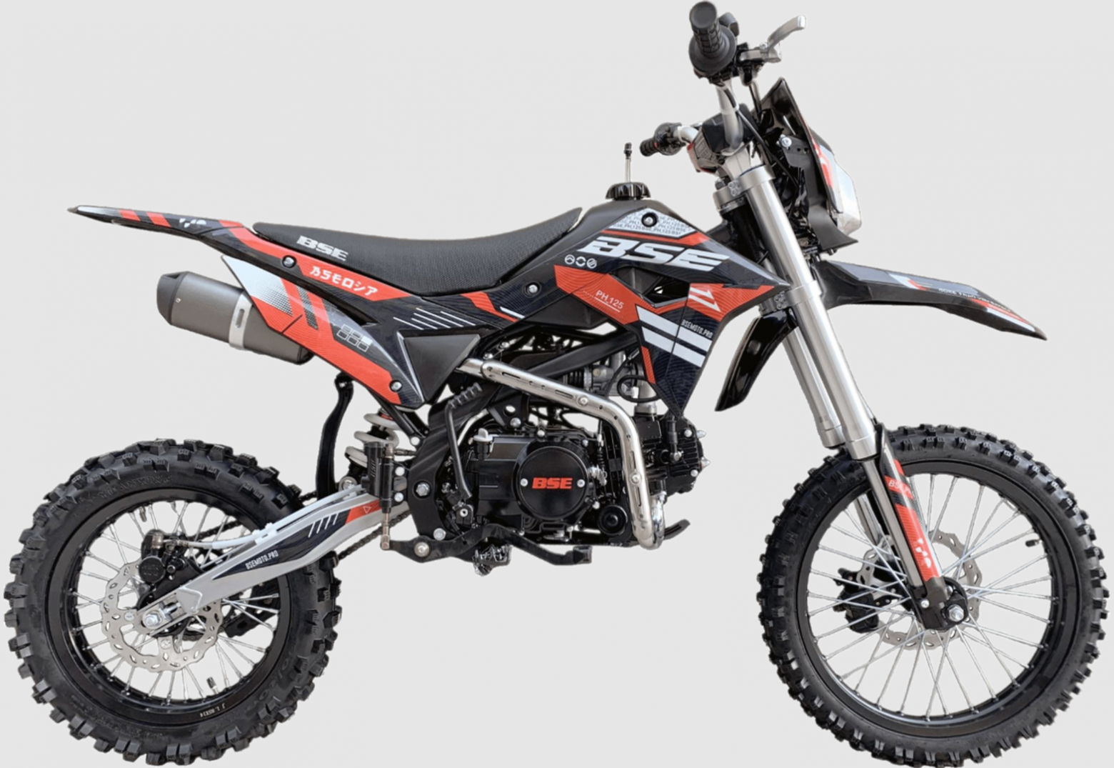 Питбайк BSE PH125 на колесах 17/14 дюймов – один из самых популярных, надежных и продаваемых питбайков 125 куб см среди китайских производителей! Этот классический питбайк объёмом 125 см3 обладает рядом модификаций и полезных усовершенствований, которые дополняют его функционал и отличают от конкурентов. PH125 оснащен колесами классическим для питбайка размером колес 17/14. Основа PH125 - рама из хромомолибденовой стали повышенной жесткости с литыми усилителями - фирменный знак качества завода BOSUER! Cиловая установка питбайка – надежный, тяговитый и мощный 4-тактный двигатель Zonghshen 125 куб см с воздушным охлаждением и мощностью 10 лс. Питает мотор карбюратор Jingke PZ 26. Питбайк оснащен 4-ступенчатой механической трансмиссией. Запуск мотора осуществляется при помощи электростартера или кик-стартера. Подвески с большими ходами: передняя - телескопическая вилка перевёрнуто типа, задняя- моноамортизатор. "Злая" резина, Мощная тормозная система HSK Racing, японские колесные подшипники NTN, усиленная цепь 428 Gold, защита мотора - питбайк полностью укомплектован всем необходимым для покатушек и гонок. В описании указаны основные характеристики товара.