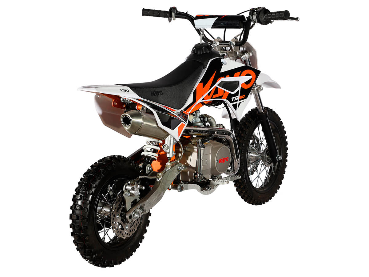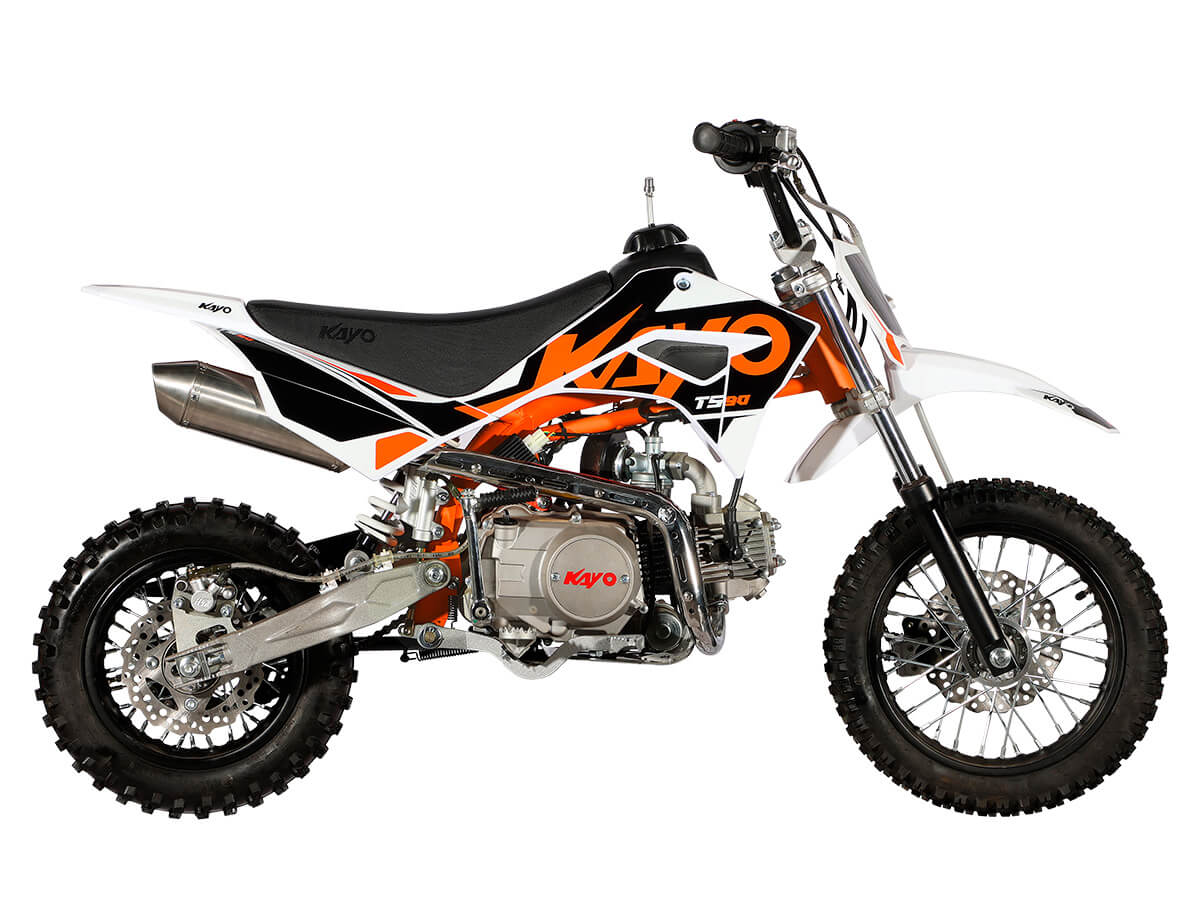 Питбайк KAYO Mini TS90 12/10 2022 года – идеальный снаряд для юных экстремалов, который можно использовать на лёгких кроссовых трассах и дорогах с различным покрытием. Удобный, простой и надёжный мотоцикл, который полностью оправдывает свою цену. Одноцилиндровый 4-тактный двигатель воздушного охлаждения ZONGSHEN YX147FMF объёмом 88 см3, выдаёт 5,5 л.с. Карбюратор JK PZ19 обеспечивает бесперебойную работу техники в самых жёстких условиях эксплуатации, простоту и лёгкость в обслуживании, а также неприхотливость к качеству топлива. Мотоцикл оснащён полуавтоматической 4-ступенчатой коробкой передач с формулой “N-1-2-3-4”. Запуск двигателя осуществляется с помощью кнопки на руле или рычага кикстартера. Мотоцикл имеет вес всего 60 кг. Усиленная рама из хром-молибденового сплава и подвеска позволяют эффективно амортизировать удары при езде по неровностям и препятствиям на трассе.Передняя подвеска – телескопическая вилка длиной 540 мм, задняя – моноамортизатор 270 мм. Рама и пластик являются собственной разработкой производителя. Мотоцикл оснащён классическими стальными спицованными колёсами диаметром 10 и 12 дюймов. Эффективное и безопасное замедление с любых скоростей обеспечивают гидравлические дисковые тормоза. Высококачественная износостойкая резина с развитым протектором отлично держит дорогу на различных типах покрытия. Если вы ищете послушный, компактный, динамичный и красивый питбайк для своего малыша, считайте, что вы его нашли. В описании указаны основные характеристики товара.
