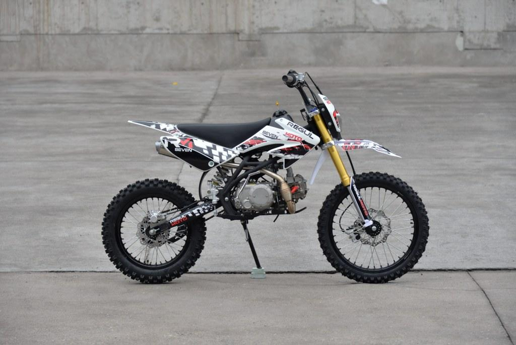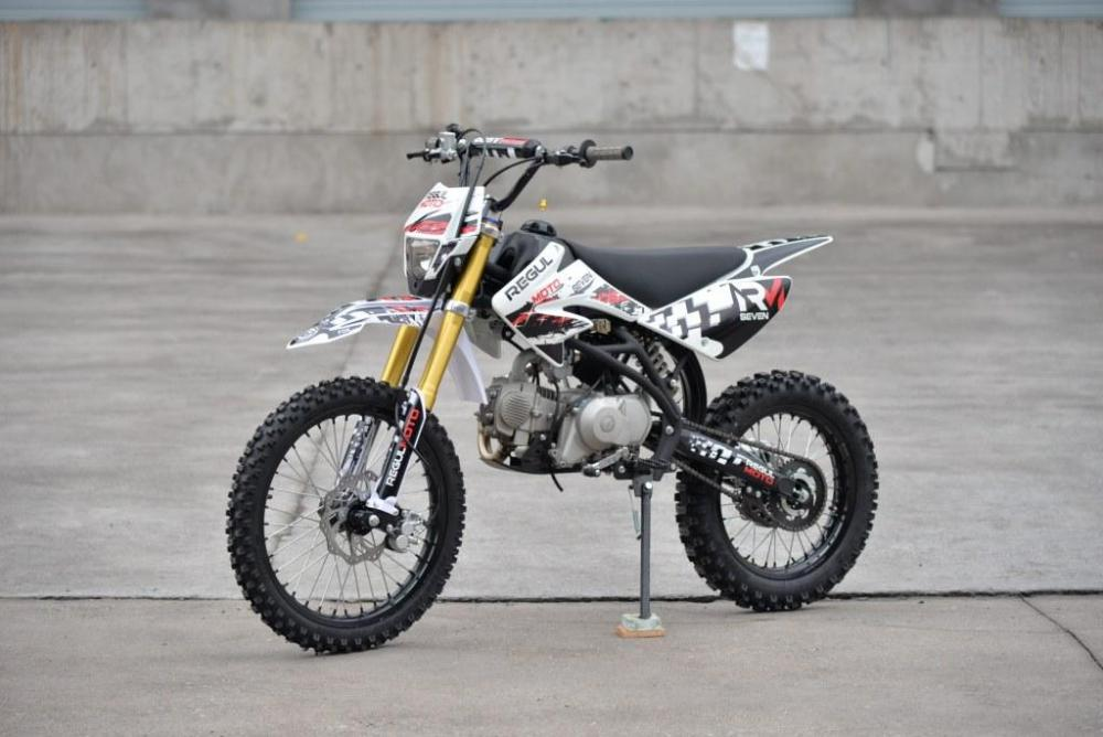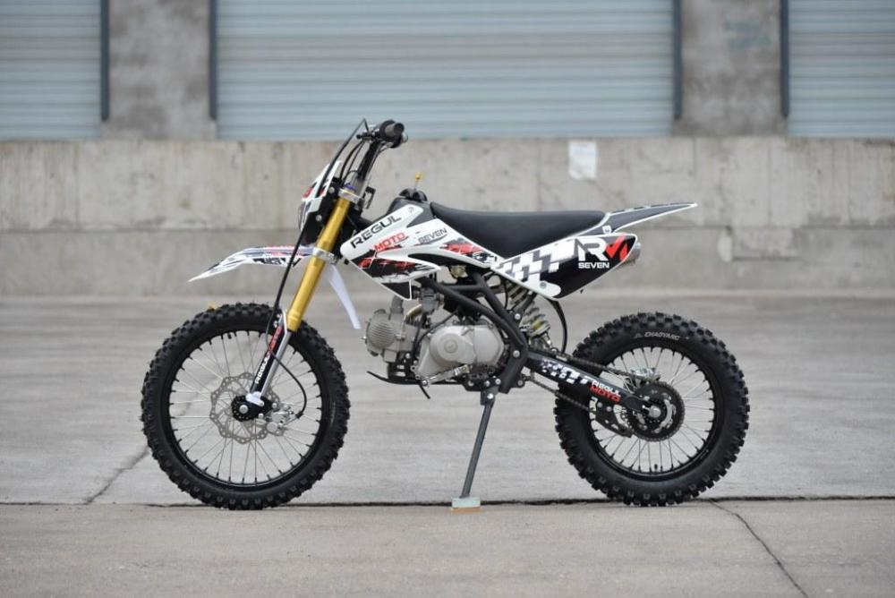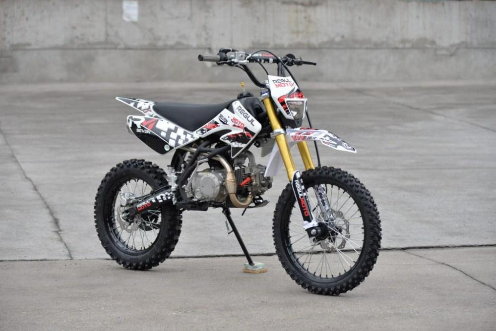 Представляем вниманию поклонников офф-роада питбайк Regulmoto SEVEN MEDALIST 150E – новинку мототехники Regulmoto модельного ряда 2021 года. У нас Вы можете купить этот питбайк с бесплатной доставкой по РФ . Также его можно приобрести в рассрочку или в кредит. Regulmoto SEVEN MEDALIST 150E – оптимальный выбор для райдера, который позволит своему владельцу совершенствовать навыки управления мототехникой на треке мотостадиона, а также получать максимальное удовольствие от офф-роад рейдов. В раме Regulmoto SEVEN MEDALIST 150E установлен 140-кубовый 4-тактный YX(X150) – этот двигатель отлично себя зарекомендовал в качестве надежного и простого силового агрегата. Подготовкой топливной смеси занимается карбюратор Nibbi. Запуск мотора возможен как при помощи тумблера электростартера, так и привычной ножкой кика. Колеса питбайка размером 17/14 дюймов с усиленными алюминиевыми ободами на 36 спиц «обуты» в качественную кроссовую моторезину Kenda. Установленные на колесах буксаторы предотвратят проворачивание покрышки и защитят камеры от возможных повреждений. Питбайк комплектуется фарой головного света; она включается при помощи поворота ключа в замке зажигания. В качестве элементов защитного обвеса используются пластиковые обтекатели типа CRF. Подбор комплектующих свидетельствует о полной готовности питбайка к покорению бездорожья. Среди стоковых компонентов питбайка стоит отметить: