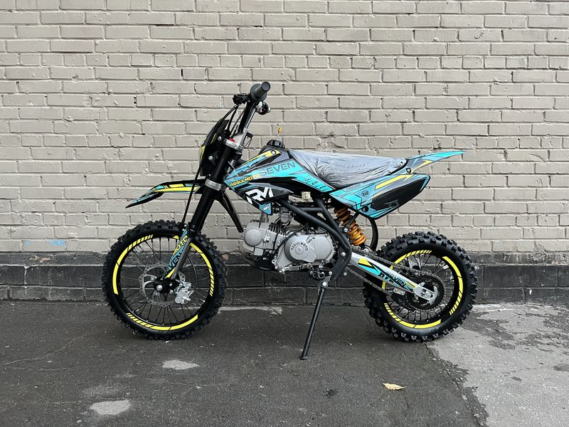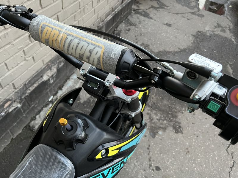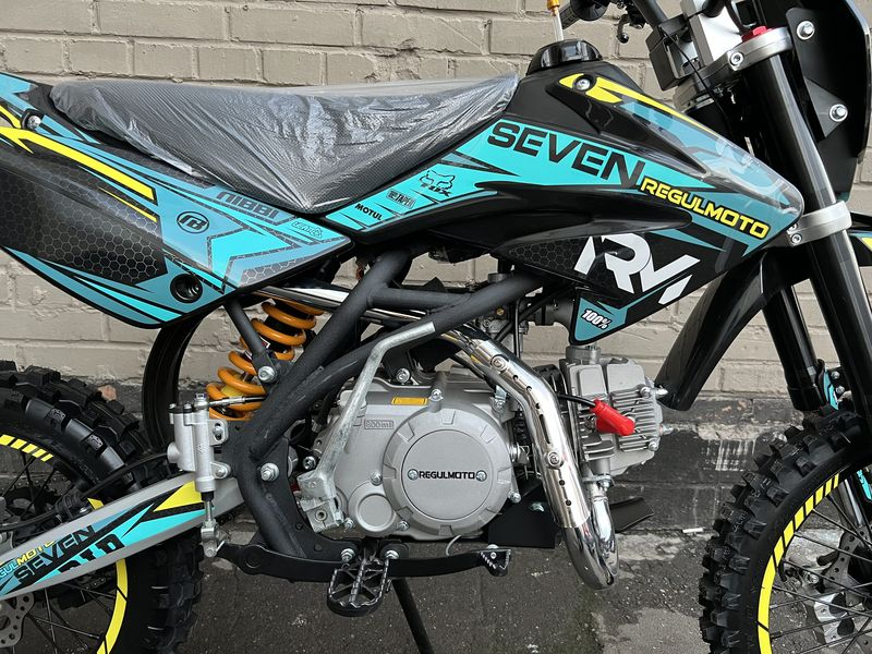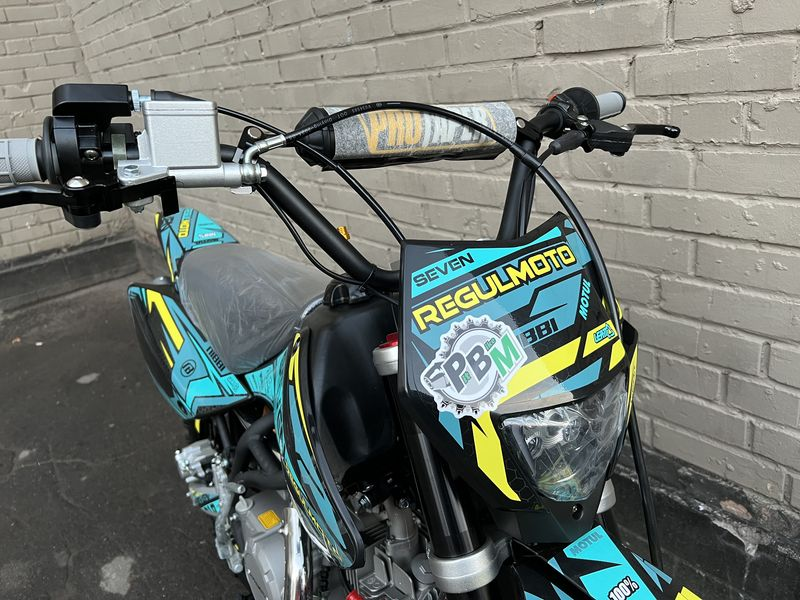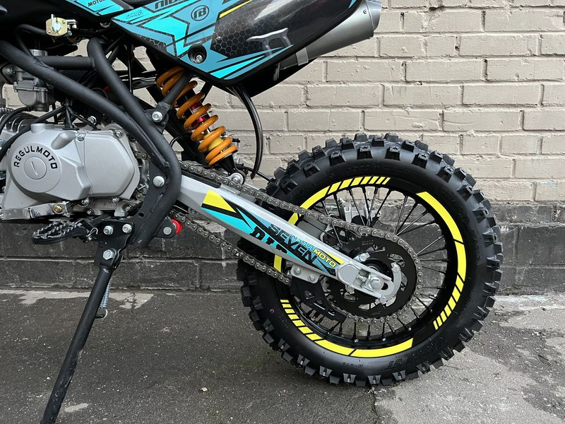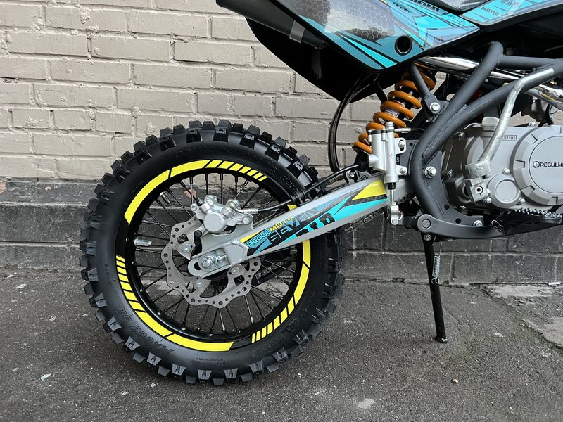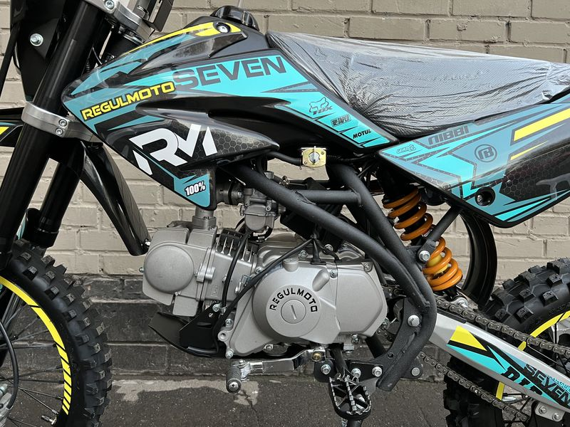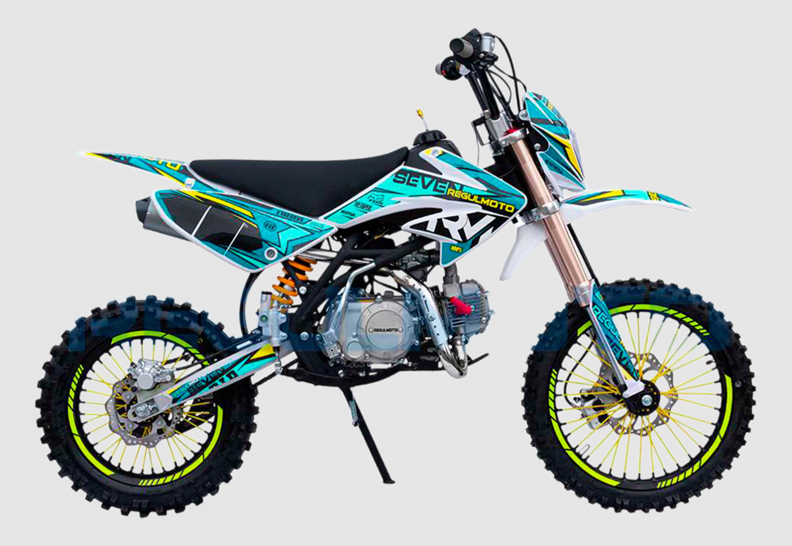 Представляем вниманию поклонников офф-роада и фри-райда питбайк Regulmoto Seven – новинку мототехники Regulmoto модельного ряда 2020 года. Regulmoto Seven – оптимальный выбор для райдера, который позволит своему владельцу совершенствовать навыки управления мототехникой на треке мотостадиона, а также получать максимальное удовольствие от офф-роад рейдов. В раме Regulmoto Seven установлен 125-кубовый 4-тактник YX с электростартером– этот двигатель отлично себя зарекомендовал в качестве надежного и простого силового агрегата. Подготовкой топливной смеси занимается карбюратор Nibbi PE19. Запуск мотора возможен как при помощи кнопки электростартера, так и привычной лапкой кика. Колеса питбайка размером 17/14 дюймов с усиленными алюминиевыми ободьями на 36 спиц «обуты» в качественную кроссовую моторезину Kenda. Установленные на колесах буксаторы предотвратят проворачивание покрышки и защитят камеры от возможных повреждений. Питбайк комплектуется фарой головного света; она включается при помощи поворота ключа в замке зажигания. В качестве элементов защитного обвеса используются пластиковые обтекатели типа CRF. Подбор комплектующих свидетельствует о полной готовности питбайка к покорению бездорожья. Среди стоковых компонентов мини-мотоцикла стоит отметить: