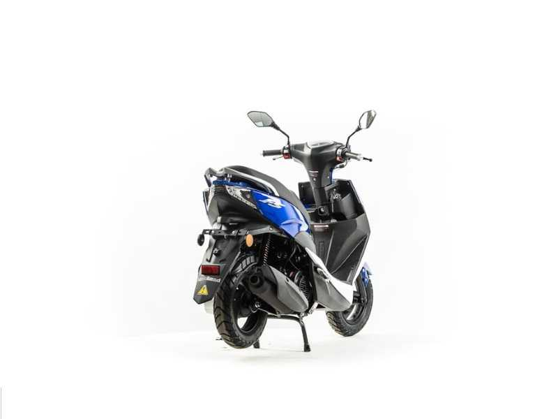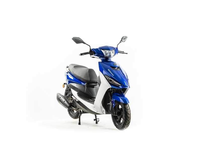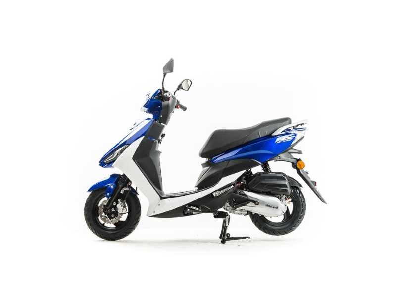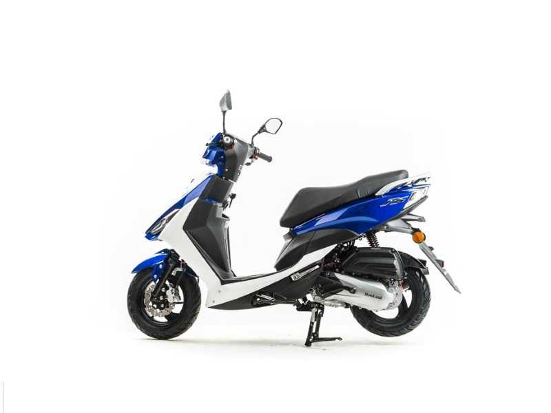 Кроме того, скутер оснащен удобными функциональными элементами: багажным отделением под сиденьем, зеркалами заднего вида, боковой и центральной подножками. Система запуска включает кикстартер и электростартер, а подача топлива осуществляется через карбюратор. Объем топливного бака составляет 5 литров.